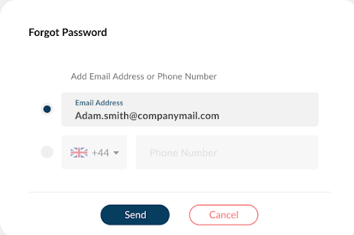 You will then be presented with a screen to confirm the method you’d like to use to reset your password – either your registered email address or mobile number.